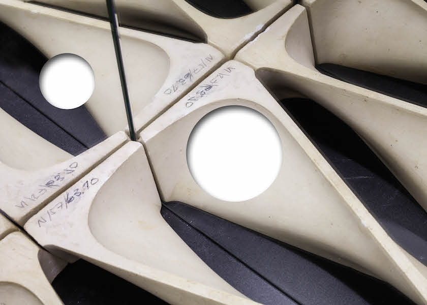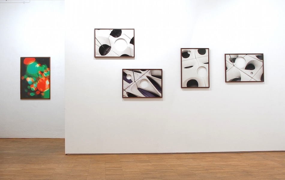 Die Modelle der durchbruchplastischen Elemente von Prof. Hubert Schiefelbein für das Fachgebiet »Plastisches Gestalten und architekturbezogene Kunst« an der Fakultät Architektur der Hochschule für Architektur und Bauwesen, Weimar bilden das Ausgangsmaterial für diese Arbeit. Von 1965 bis 1995 hielt Schiefelbein die einzige künstlerische Professur an der Hochschule inne und entwickelte ornamentale Formskulpturen zur Verzierung von Gebäuden oder Begrenzung von Grundstücken. Im Archiv der Moderne der Bauhaus-Universität Weimar sind jeweils 1-2 Modelle der Formplastiken Schiefelbeins erhalten. Diese wurden für diese Arbeit in einen »endlosen« Spiegelraum räumlich inszeniert und in unterschiedlichen Perspektiven fotografiert. Aus diesen Fotooriginalen wurden anschließend Kreise ausgeschnitten. Durch den Spiegelraum erhalten die Formskulpturen ihre ursprüngliche Serialität zurück - durch das mehrfache Durchschneiden stellt sich eine dreidimensionale Wirkung ein. Mithilfe des fotografischen Versuchs und des Durchbruchs erlangen die Bilder der Formskulpturen ihre eigentliche Funktion als offene architektonische Wandreliefs zurück.