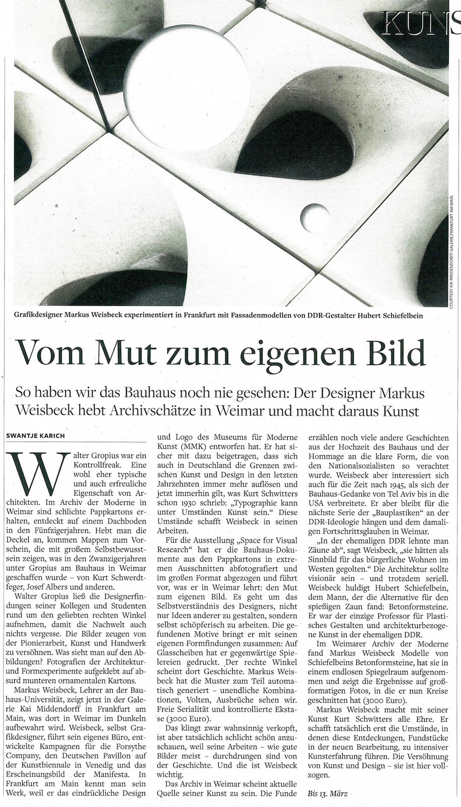 Die Arbeit von Markus Weisbeck bedient sich der Alben als Repertoire für Form und Komposition indem extreme Ausschnitte der Originaldokumente als neues fotografisches Bild entstehen. Erweitert werden diese rechtwinkligen Kompositionen durch ein Gegenmodell heutiger digitaler Mustergenerierung, die thematisch und formal die gestalterischen und technologischen Ergebnisse der Originalebene aufgreift, durch Reproduktion via Siebdrucktechnik auf der Glasscheiben der gerahmten Bilder optisch jedoch getrennt bleibt.